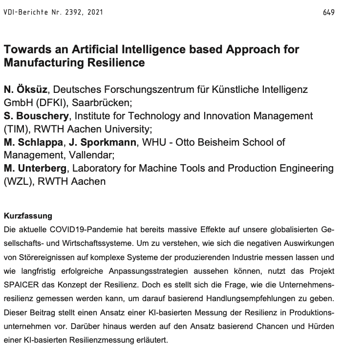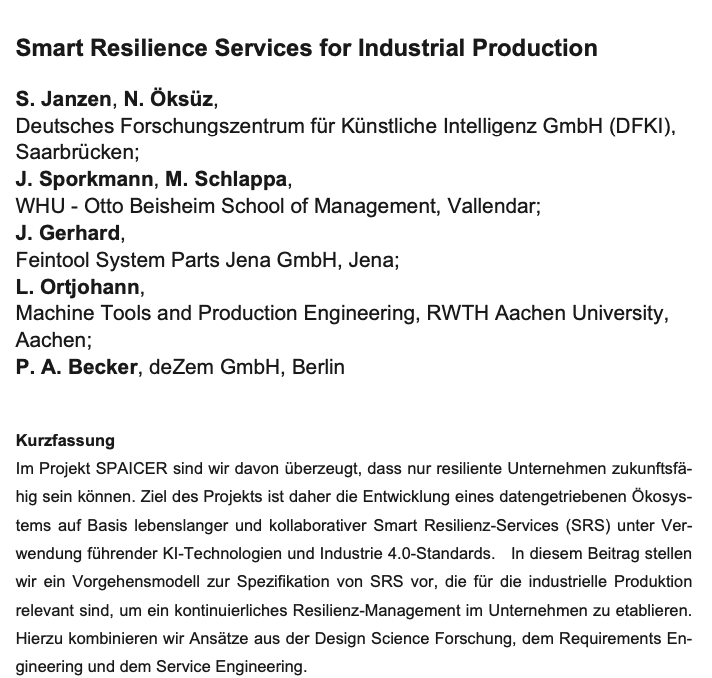 Ziel des Forschungsprojekts SPAICER ist die Entwicklung eines Rahmenmodells und niedrigschwelliger, kollaborativer Smarter Resilienz-Services zur Unterstützung eines KI-basierten Resilienz-Management für Produktionsunternehmen in Produktionssystemen. Dadurch können Unternehmen Störungen frühzeitig antizipieren und auf eingetretene Störungen reagieren, um Produktionsplanungen passend zu optimieren. Kern von SPAICER ist ein agentenbasierter, modularer und offener Ansatz zur Entwicklung Smarter Resilienz-Services, welche basierend auf führenden KI-Technologien und Industrie 4.0–Standards in ein Ökosystem zum Austausch von Daten, Software und Modellen eingebettet sind.